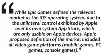 The determination of the 'relevant market' for competition is a vital aspect of every antitrust/competition law litigation, and so the definition was deliberated upon in this regard, basis the representations made by either party. While Epic Games defined the relevant market as the iOS operating system, due to the unilateral control exhibited by Apple over its own system App Store, which are only usable on Apple devices. Apple proposed definition of the market included all video game platforms (mobile games, PC games, console games).