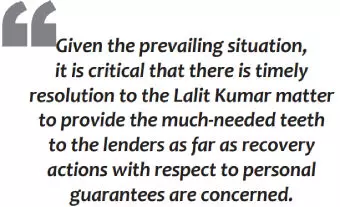 Given the prevailing situation, it is critical that there is timely resolution to the Lalit Kumar matter to provide the much needed teeth to the lenders as far as recovery actions with respect to personal guarantees are concerned. In fact, the Government has made its stance apparent by the issuance of directions by the Department of Financial Services in the Finance Ministry to public sector banks to put in place a mechanism for monitoring cases, which may require initiation of insolvency proceedings against personal guarantors of corporate debtors.