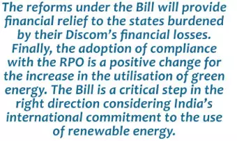 The Bill also proposes to help in handling issues like cross-subsidy losses, poor infrastructure, and losses. This will enhance the competitiveness of domestic industries in the power sector. The reforms under the Bill will provide financial relief to the states burdened by their Discom's financial losses. Finally, the adoption of compliance with the RPO is a positive change for the increase in the utilization of green energy. The Bill is a critical step in the right direction considering India's international commitment to the use of renewable energy.